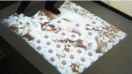 地面互动投影 用双脚或动作与投影幕上的虚拟场景进行交互,各种互动效果就会随着你的脚步产生相应的变幻。包括水波纹、翻转、碰撞、擦除、避让、跟随等表现形式。观众通过身体动作来与地面的图像进行互动,有一种新奇的体验。